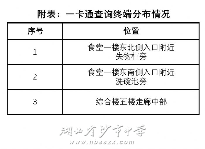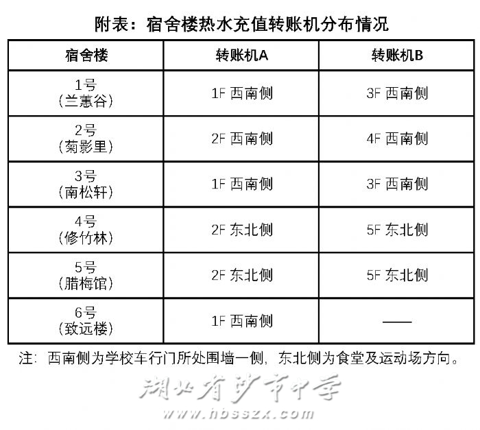 湖北省沙市中学一卡通校园卡集成有热水消费功能。用户欲在宿舍内使用热水时,需先持校园卡到热水充值机上自助充值(热水充值机分布情况见附表),再回宿舍将卡插入热水控制器即可取用热水。热水控制器计时收费,直到校园卡从控制器拔出才会停止计时。热水充值时每次刷卡固定充入10元,如非所需,用户不要一次充入太大的数额。