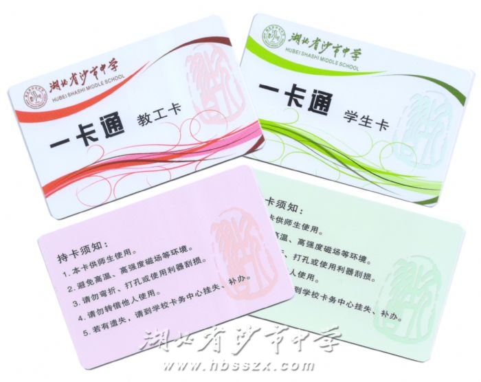 湖北省沙市中学一卡通校园卡是一张非接触式IC卡,可以实现校内的身份识别、非现金消费等功能。师生凭籍此卡,能够在校内食堂、超市、书店消费,能够进出宿舍、使用热水,能够实现会议签到、活动考勤等功能。