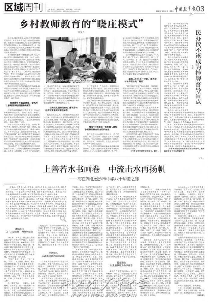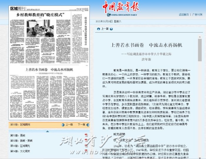 《中国教育报》2021年10月16日第3版刊发了我校80周年校庆专题文章《上善若水书画卷 中流击水再扬帆——写在湖北省沙市中学八十华诞之际》。