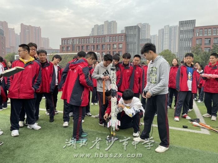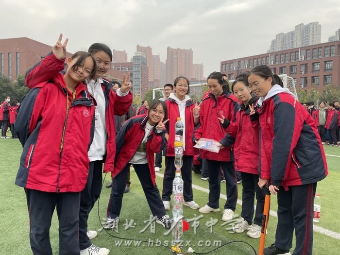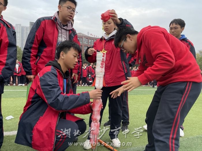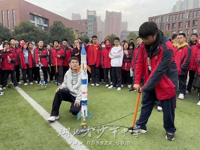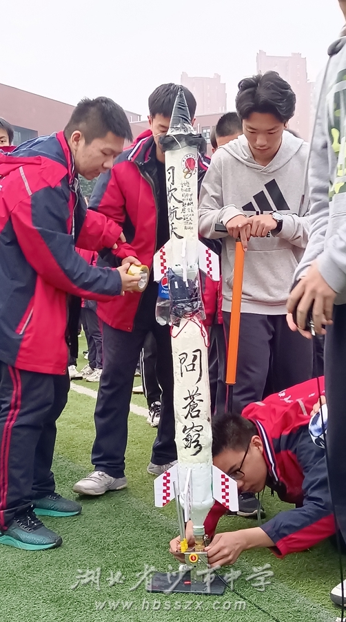 为庆祝沙市中学建校80周年,培养高中生设计、制作和创新的能力,提高学生的科技素养,倡导爱校爱国的精神,沙市中学物理教研组和科技实验中心于11月16日下午在体育场联合举办了以“建校八十,中华腾飞”为主题的水火箭竞赛活动。水火箭的基本原理与真实火箭相同,利用反冲作用力推动火箭发射。其利用废弃的可乐瓶等材料,真正实现了节能减排的科学环保理念。