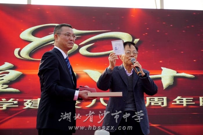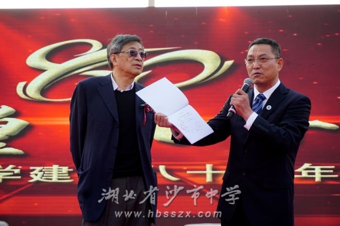 两位院士的开场白之后,熊礼才校长向两位院士赠送了有着特别意义的礼品。据介绍,赠给樊明武院士的礼品是他在沙市中学就学时的成绩档案、操行评语等;赠给陈和生院士的礼品是他在沙市中学和同事们在一起工作的照片、个人填写的工作记录表等。两位院士也回赠了沙市中学礼品。樊院士将自己的院士证原件、中央党校毕业证、出席全国党代会、人代会的参会证等赠送给了学校;陈院士将自己珍藏的北京正负电子对撞机建成纪念盘送给学校,并介绍了纪念盘上由著名画家李可染先生创作的阴阳图的深刻内涵。