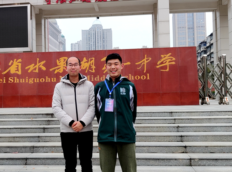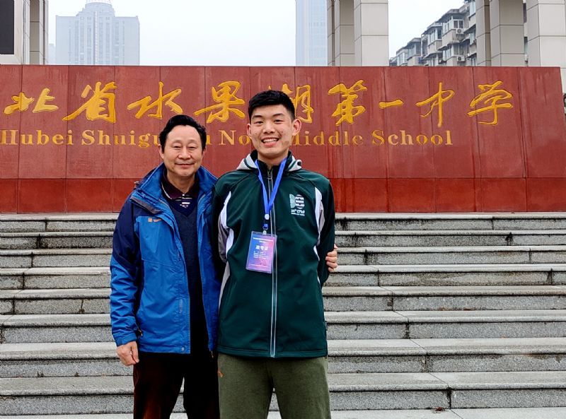 沙市中学物理竞赛教练余小路与秦禹潮同学合影