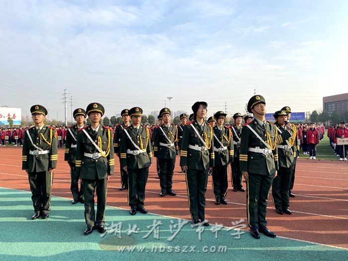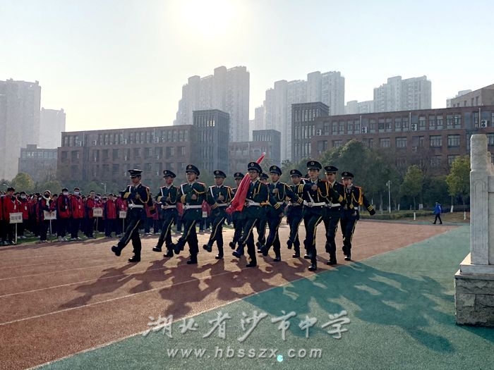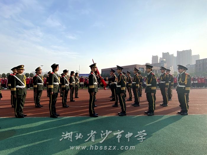 紧接着,新一届国旗班全体成员在班长张沈娟同学的带领下,面向国旗,庄严宣誓:志愿加入湖北省沙市中学国旗班,接受爱国主义教育,发扬国旗班精神,爱国爱校,爱护国旗,认真执行《国旗法》,拥护国旗班制度,遵守国旗班各项规定,做捍卫国旗的钢铁战士,以火红的青春,谱写国旗礼赞,用热忱生命,捍卫国旗尊严。