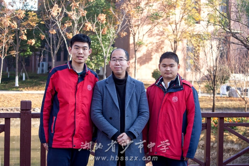 沙市中学物理竞赛教练余小路与两名获奖学生合影
