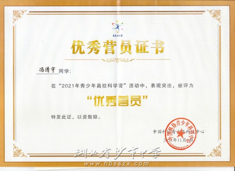 近日,从荆州市科协获悉,沙市中学高二(4)班冯清宇同学荣获“2021年青少年高校科学营”全国优秀营员称号。该荣誉由中国科协青少年科技中心授予,用于表彰在“2021年青少年高校科学营”中成绩突出、表现优异的学生。