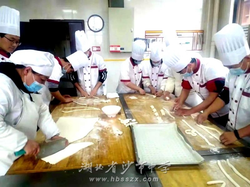 学生社团“易味轩”的社员们在食堂大师傅的指导下制作面点