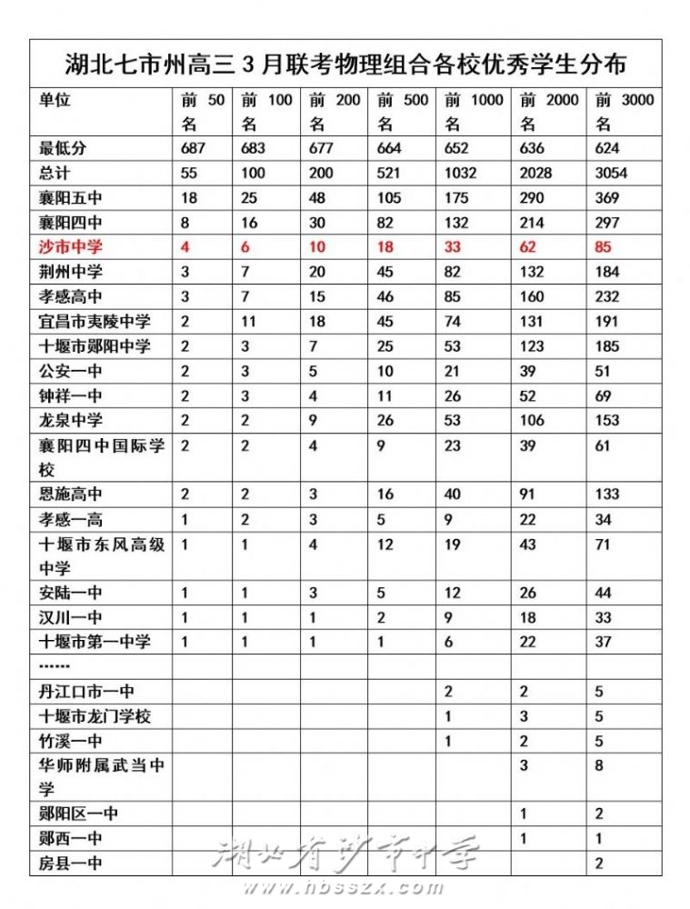 湖北省七市州高三3月联考优生分布