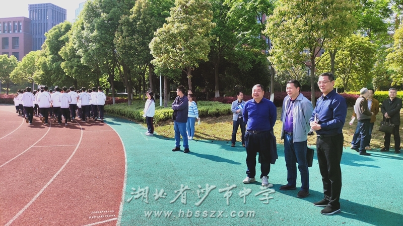 市教科院党总支成员、工会主席陈子俊布置工作流程,提出工作纪律要求 观看大课间。高一高二同学着装统一,队伍整齐,口号响亮,精神抖擞地迎接视导。