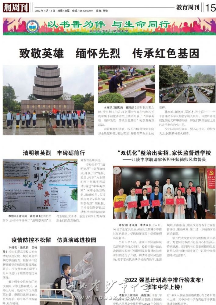 《荆周刊》2022年4月11日报道我校清明系列活动和上榜《2022强基计划破格资格名单和高中排行榜》