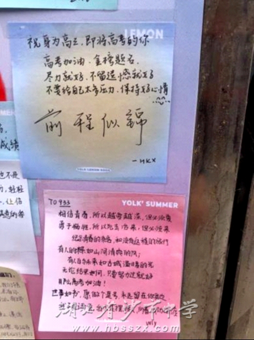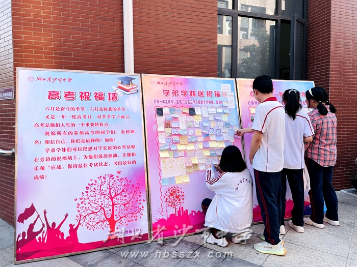 在送祝福活动过程中,同学们认真书写着他们的祝福,亲手绘制祝福墙,祝福语里,有给高三学子们增加干劲的:“稳过一本线,迈向211,冲进985!”;也有给高三学子们疏导心情的:“尽力就好,不留遗憾就好,不要给自己太多的压力,保持好心情”;“致高三:愿你所愿皆能成真,愿你所记皆为所考!”……