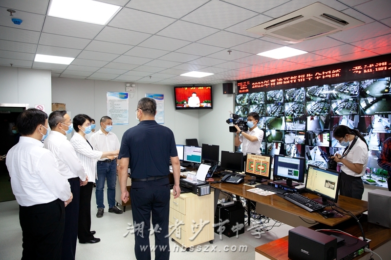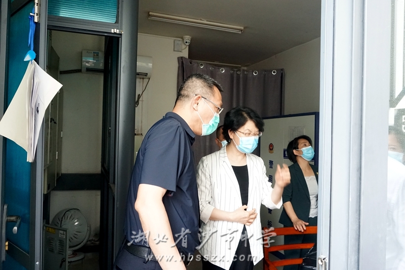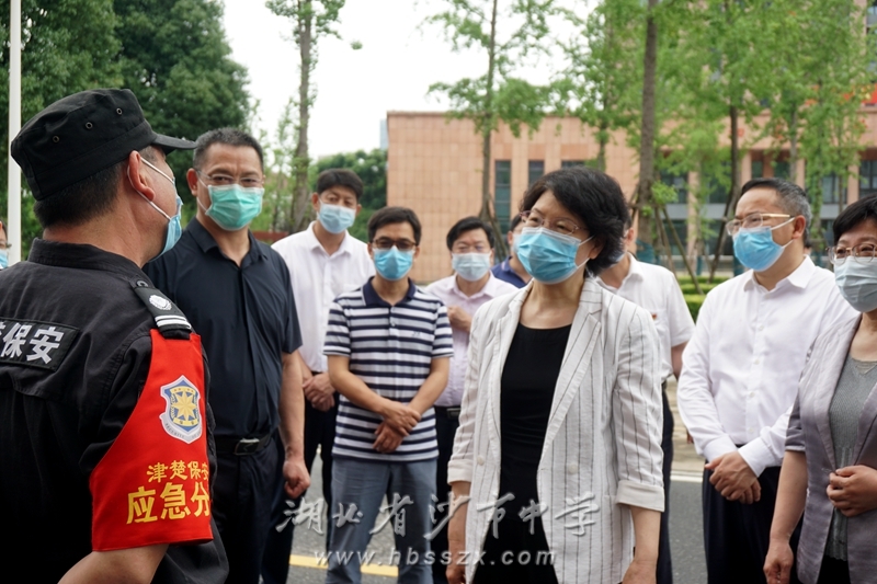 在沙市中学考点,肖菊华一行沿着考生入场路线,实地检查了测温通道设置和设备运行状况。在东门保安室,副市长严红按下学校一键报警系统,信号很快联通了公安系统,肖菊华表示满意,并与日夜值守的安保人员亲切交谈。