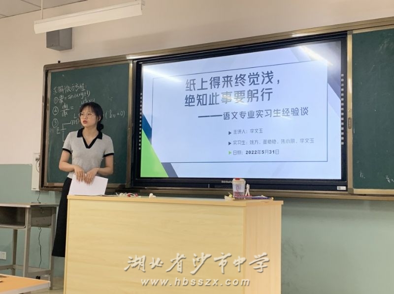 教师发展中心副主任张瑶总结 5月31日下午,沙市中学在高一教学楼405教室召开了长江大学教育硕士实习阶段成果分享会,教师发展中心副主任张瑶出席了本次分享会。本学期,长江大学共计13人来到沙市中学进行实习,包括语文、英语、历史、政治、心理健康教育等五门学科。