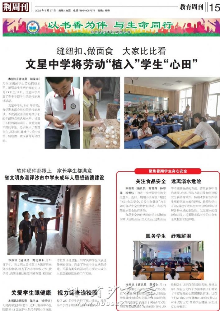 《荆周刊》2022年6月27日报道省文明办测评我校未成年人思想道德建设