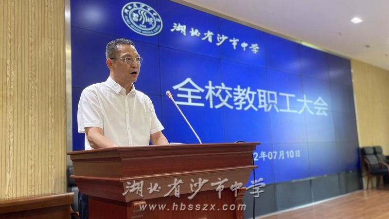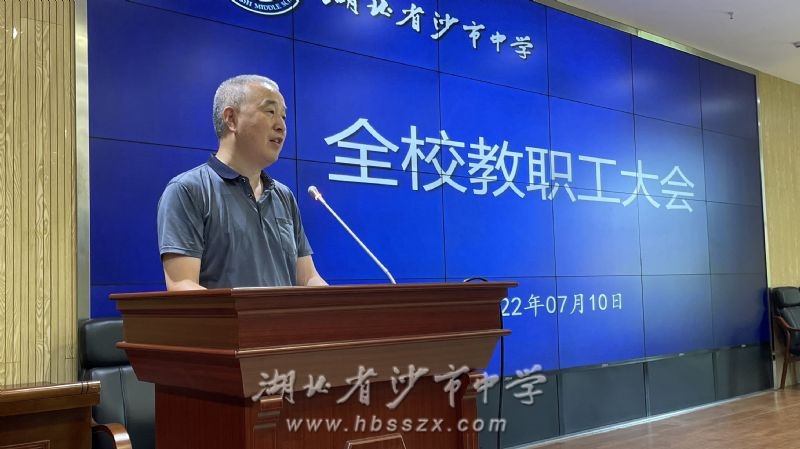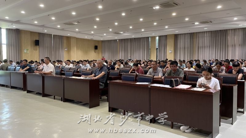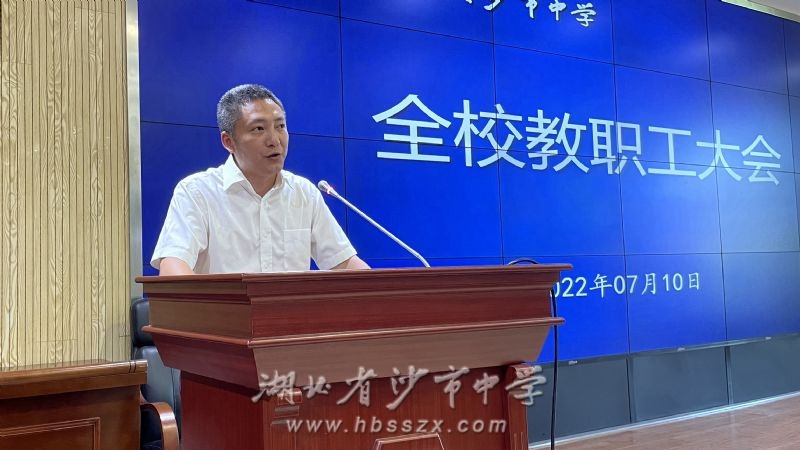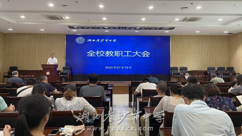 会议现场 7月10日上午9时,沙市中学全体教职员工齐聚综合楼二楼会议室,召开2022年春季学期期末教职工大会。会议由党务校务中心主任唐年新主持。
