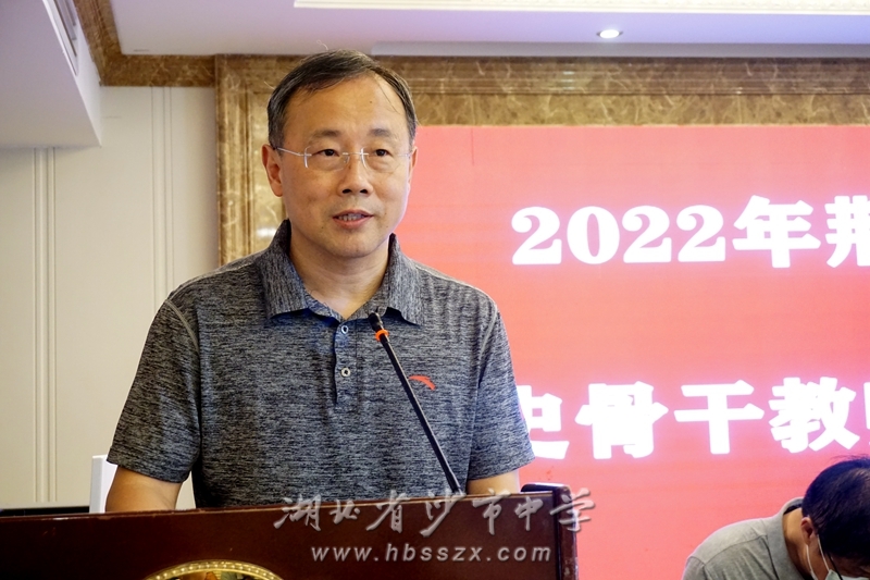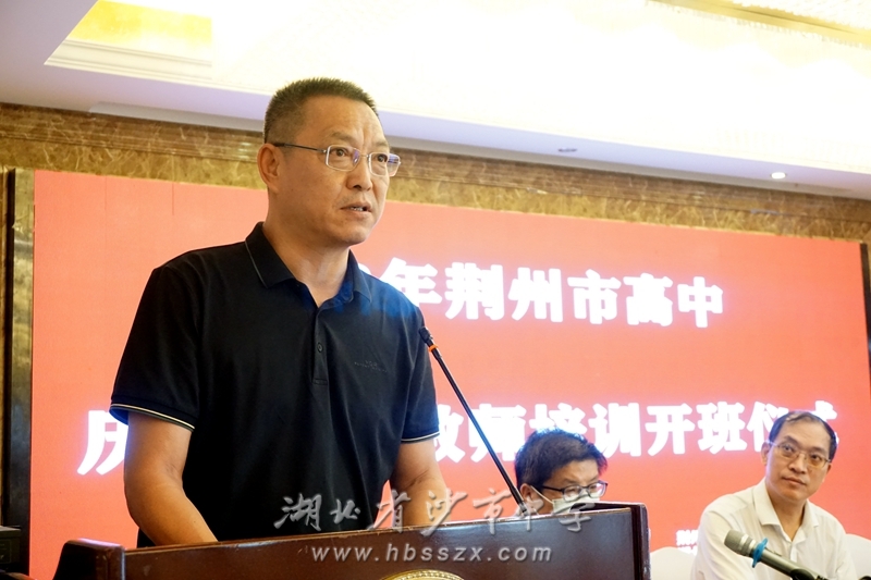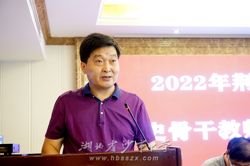荆州市教科院副院长陈子俊发言。他说,面临不断深化的高考内容改革,历史作为高考首选学科之一,历史学科教师要思考并回答:一、如何落实立德树人根本任务,二、如何发展学生的核心素养,三、如何使“双减”目标落实落地,四、怎样加强教考衔接。他希望学员带着问题去学习、去思考、去交流,专心学习,学有所成。