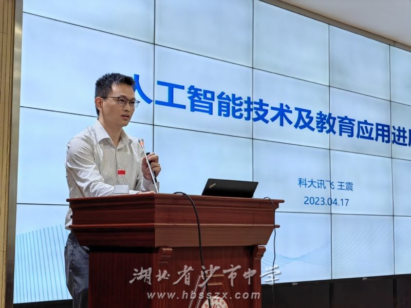 主讲人王震为老师们带来了题为《人工智能技术及教育应用进展》的报告。他结合近期ChatGPT的兴起,讲述了人工智能的定义及发展历程,并指出,以数字驱动教育变革与发展已成为世界性主题,而人工智能可以为教育数字化战略落地提供关键技术路径,能够帮助构建智慧教育环境、优化教学模式、实现因材施教,使得规模化智慧教育真正落地。