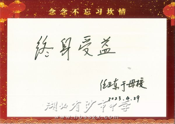 最后,任卫东一行回到习坎楼,在校友留言簿上留言:“终身受益。”他表示,希望能为家乡、为母校贡献自己的一份力量,以回馈乡梓养育之恩,并真诚祝愿母校能越办越好。