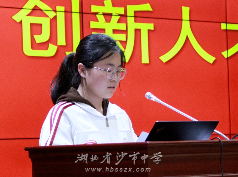 沙市中学学生会主席、2117班王梓麟同学在发言中介绍了学校注重开展素质教育课程、着眼于学生的全面发展和学生民主自治的育人文化。