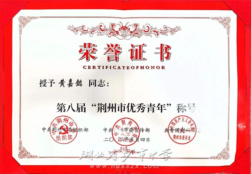 获奖证书 选树青年典型,弘扬青春能量。2023年5月4日下午,沙市中学教师黄嘉懿荣获由中共荆州市委组织部、中共荆州市委宣传部、共青团荆州市委共同评选表彰的第八届“荆州市优秀青年”荣誉称号。