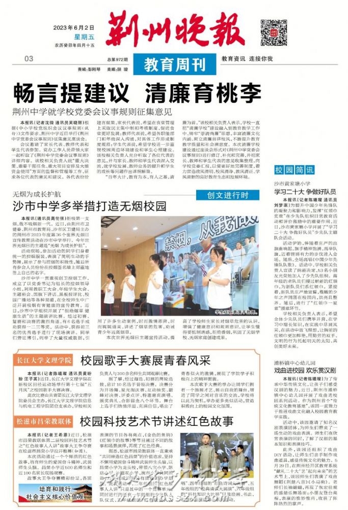 《荆州晚报》2023年6月2日报道我校多举措打造无烟校园
