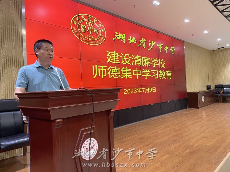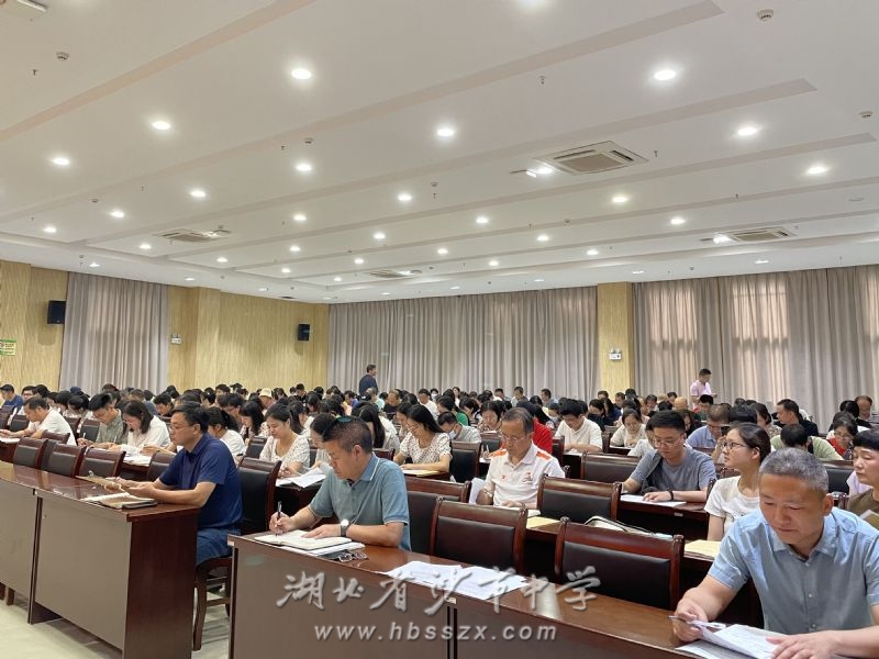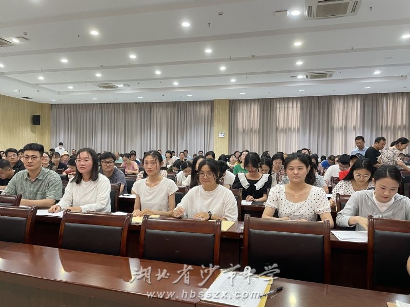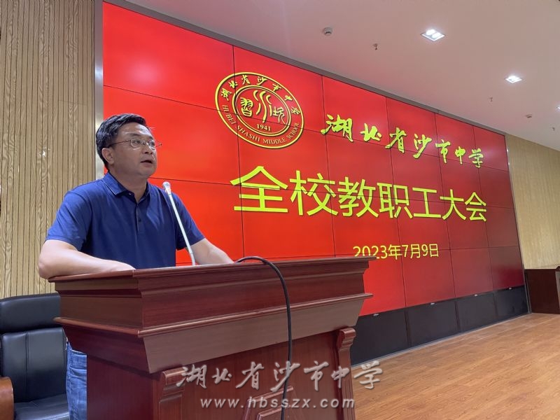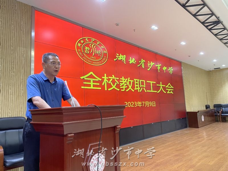 大会现场 7月9日下午,沙市中学全体教职员工齐聚综合楼二楼会议室,召开2023年春季学期期末教职工大会。会议由党委委员、副校长唐年新主持。