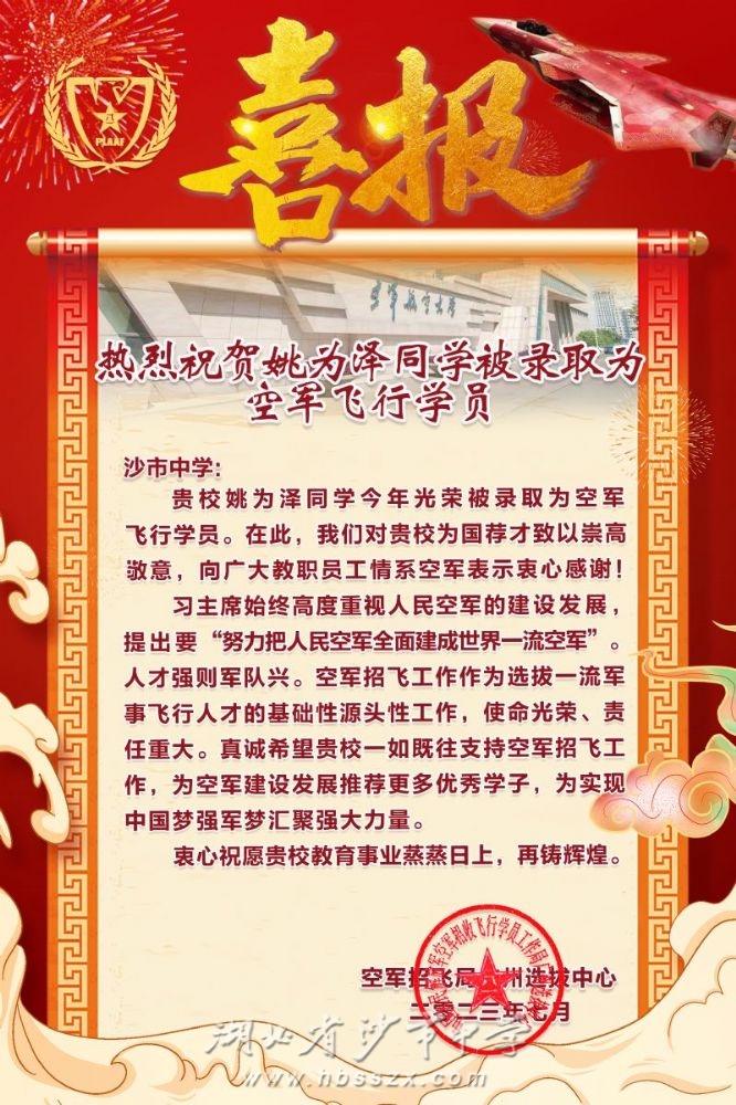 喜报 盛夏七月,凉风送爽。习坎园收到一份独特的喜报——湖北省沙市中学2003班姚为泽同学荣录中国人民解放军空军航空大学航空飞行与指挥专业,这是来自空军招飞局广州选拔中心的特大喜讯。