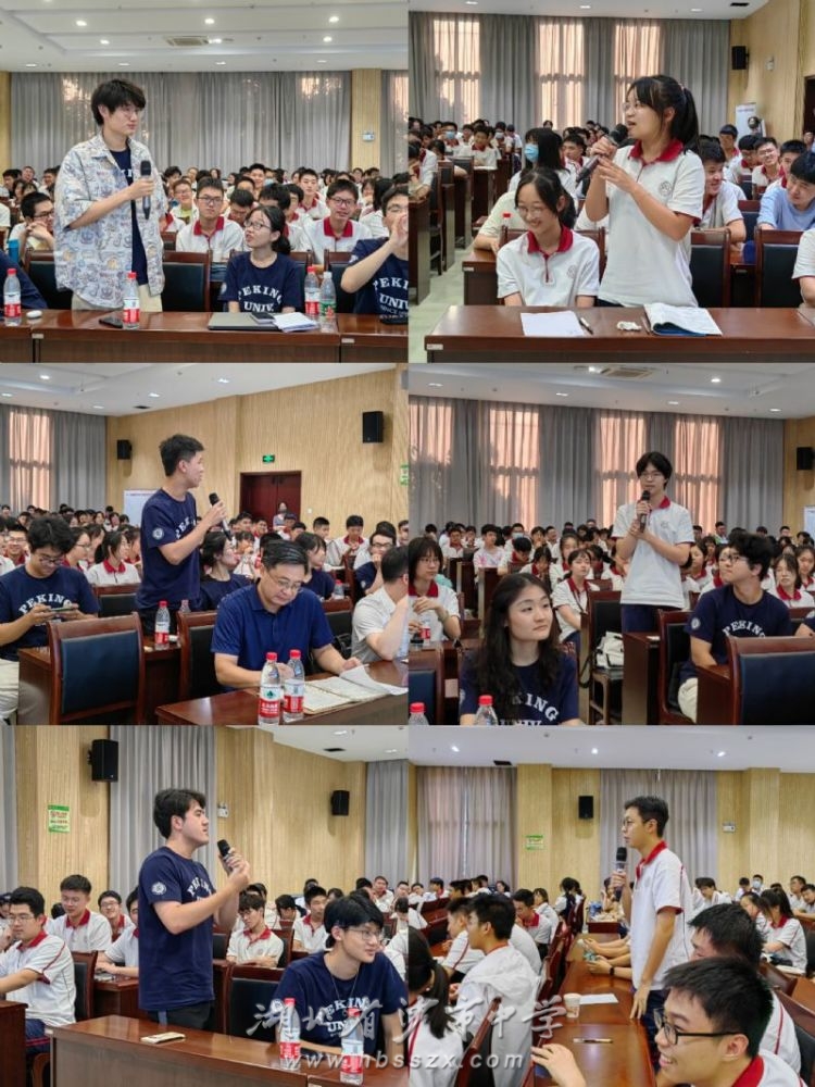交流互动环节 接着,北大光华管理学院杨安妮、肖博瀚、谷俊亿、孙宇阳、赵鎏玮、岳韵嘉等六名优秀学子分别上台交流高考备考心得。他们或是图文并茂地介绍北大丰富的活动、诱人的美食、幽静的风景,向在座学子发出“欢迎来北大”的号召,激发其高考备考内驱力;或是结合自身备考经历,给出高三临考冲刺的针对性建议,帮助在座学生进一步明确学习目标,科学规划人生;或是风趣幽默,妙语连珠,赢得满堂喝彩;或是严谨缜密,有条不紊,引导深入思考。在交流互动环节中,同学们踊跃提问,北大学子们详细解答,每一次互动,都闪烁着学习热情和学习潜力被激发后的思维火花,都凝聚着向着目标不断前行的澎湃力量。
