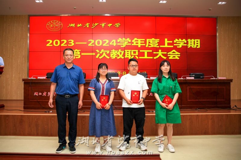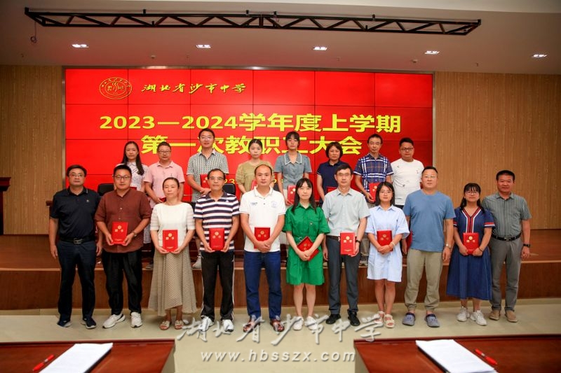 党委副书记、校长徐善慧(前排左一),党委副书记、纪委书记李义国(前排右一)与新高一年级班主任合影 时光易逝,寸暑难留,立秋后坠落的第一片木叶敲开了新学期的门扉,8月24日上午9时,沙市中学教职员工齐聚学校综合楼二楼会议室,参加2023-2024学年度上学期第一次教职工大会。会议由校办主任张珺主持。