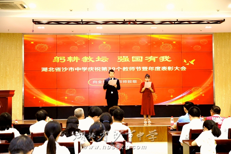 青年教师张盼、周敏担任主持人 躬耕教坛,强国有我。9月8日下午,沙市中学庆祝第39个教师节暨年度表彰大会在综合楼报告厅举行,学校领导及全体教职工参加大会,荆州市延安精神研究会会长、原荆州市人大常委会副主任、沙市中学荆沙校友会第一届会长、沙市中学71届校友幸正荣,湖北达雅生物科技股份有限公司董事长徐振明,原沙市区副区长、沙市中学81届校友李彬,湖北新地投资集团有限公司执行董事、沙市中学85届校友刘剑,深圳市华讯方舟集团有限公司高级副总裁、沙市中学87届校友项俊晖,沙市中学813奖学金秘书长、沙市中学81届校友熊克诚,沙市中学教育发展基金会理事长曹光炎等应邀出席大会。