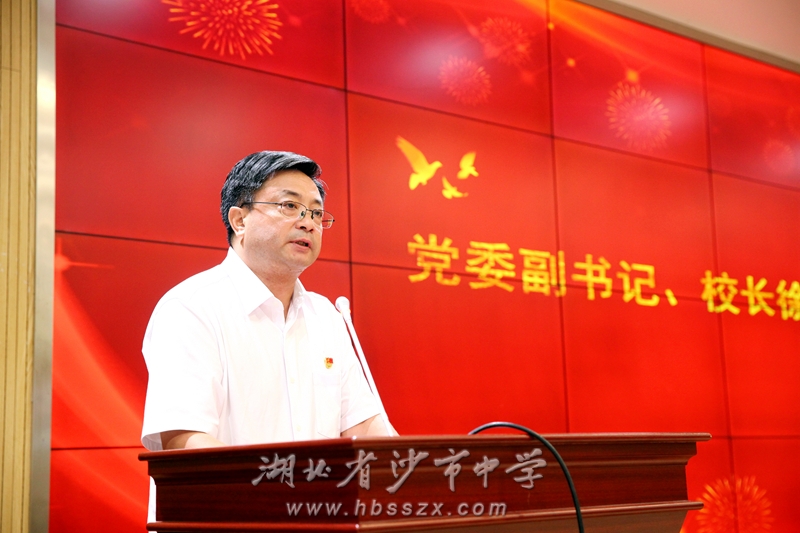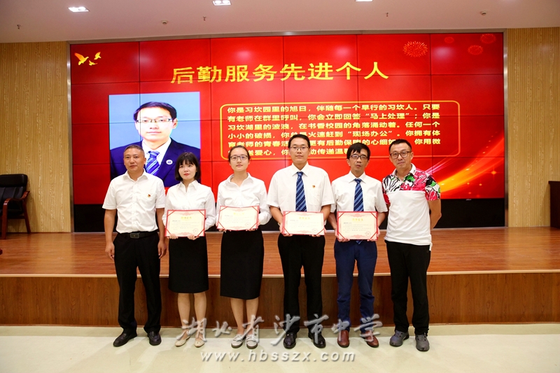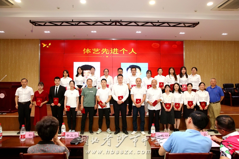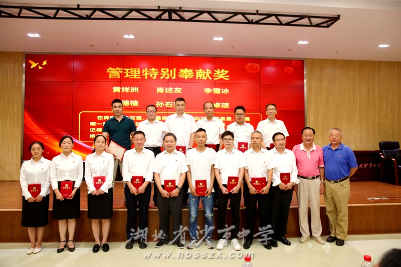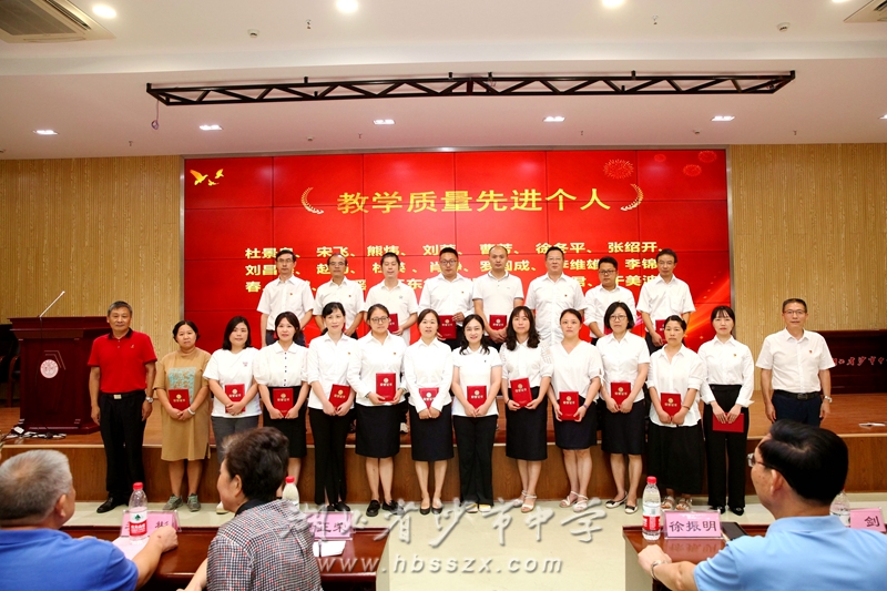 原沙市区副区长、沙市中学81届校友李彬,副校长赵文华共同颁发教学资源库建设先进组、教学比武能手、教科研先进个人、体艺先进个人等奖项。