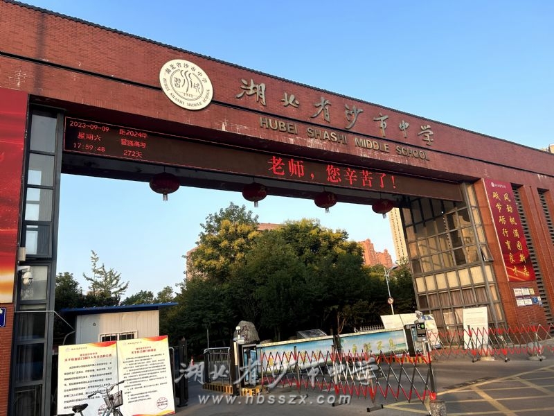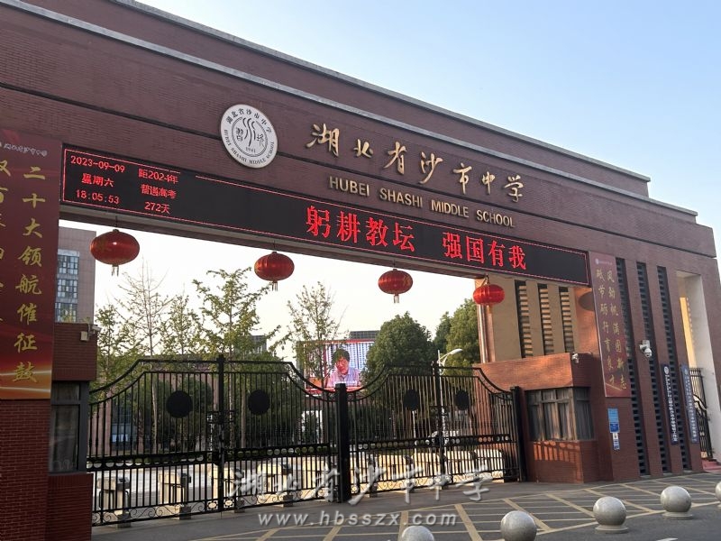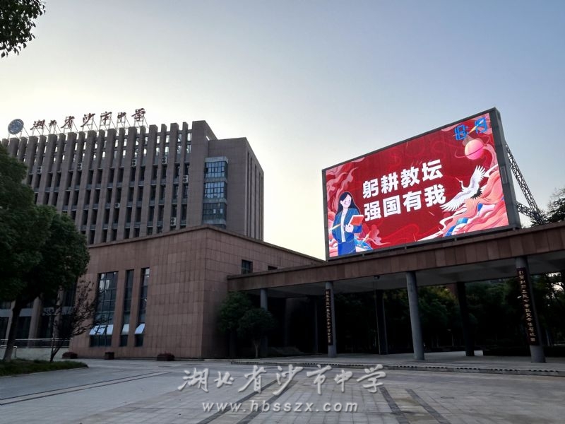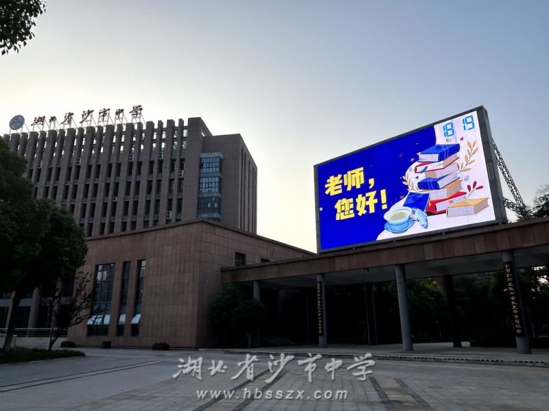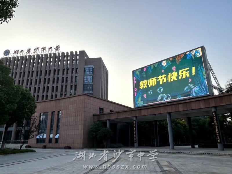 根据上级教育主管部门荆州市教育局的统一安排并结合本单位实际,沙市中学将于9月9日、10日、11日连续三晚的黄金时间在学校主体建筑至善楼(综合楼)旁的大型 LED 全彩屏上播放内容为“躬耕教坛,强国有我”、“老师,您好!”、“老师,您辛苦了!”、“教师节快乐!”等的海报图片,同时全天在学校东门门楼、南门门楼的大型 LED 文字屏上滚动显示上述文字内容。学校期望以此形式为教师"亮灯",隆重庆祝第三十九个教师节的到来。