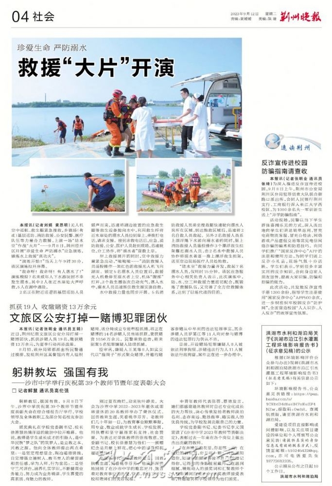 《荆州晚报》2023年9月12日报道我校举行庆祝第39个教师节暨年度表彰大会
