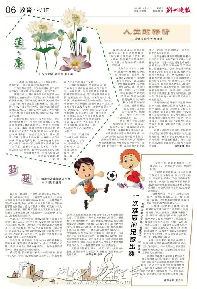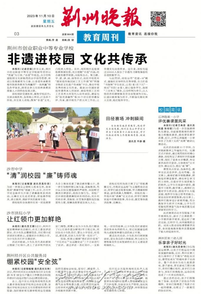 《荆州晚报》2023年11月10日报道我校举行创建"清廉校园"系列活动并刊登"清廉"征文获奖作品