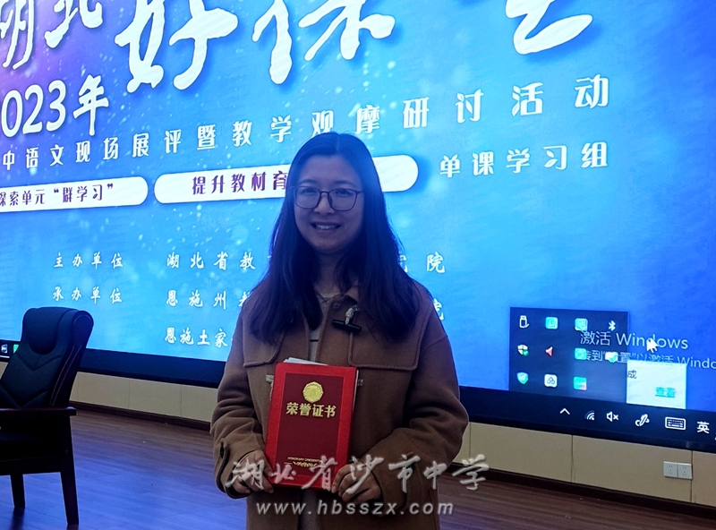 杨微老师 11月10日,我校语文教研组杨微老师在2023年“湖北好课堂”高中语文现场展评活动中,与来自华师一附中、黄冈中学、襄阳五中、恩施高中等全省知名高中的18名教师同台竞技,脱颖而出,喜获一等奖。