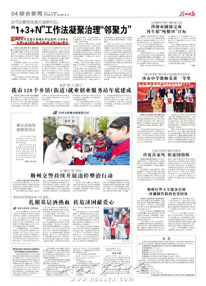 《荆州日报》2023年11月15日报道我杨微老师荣获"湖北好课堂"高中语文展评课一等奖