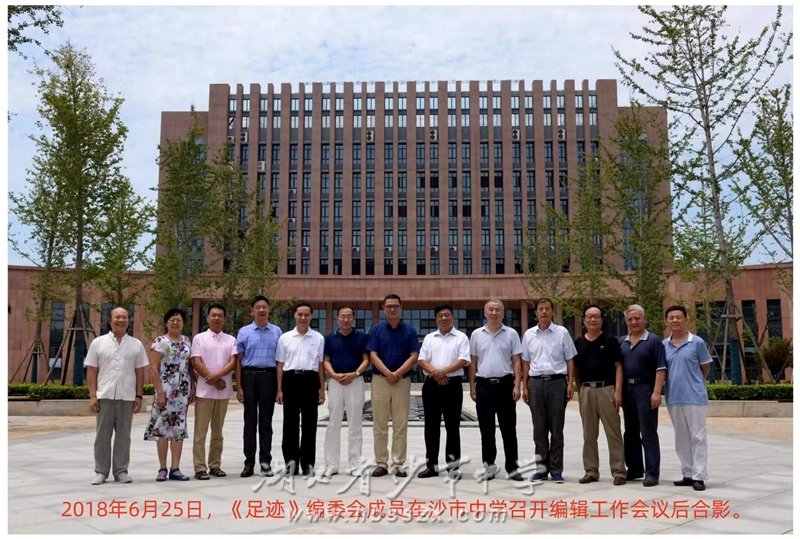 2018年《足迹》编委会与学校领导在沙市中学合影 11月24日是《足迹:沙市中学老三届文集》公开发行五周年纪念日。23日,该书编委会举行了庆祝酒会,回顾当年,情怀今朝,憧憬未来。