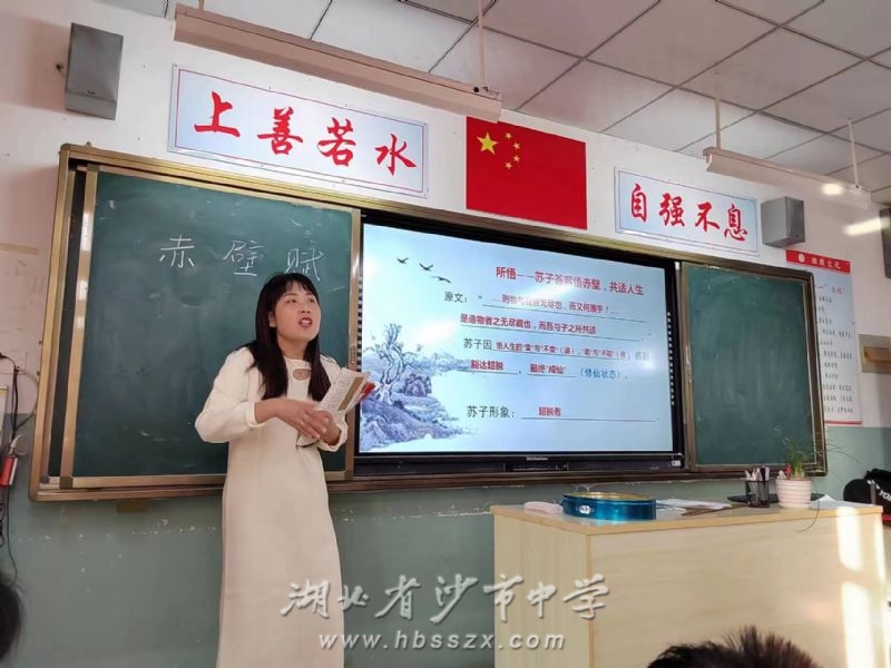 授课现场 语文观摩课由沙市中学高一语文组教师江露露执教,课题为《赤壁赋》。本堂课以《赤壁歌》导入,从所见、所闻、所悟三方面分析苏子“游赏者、失意者、超脱者”的形象和“变”与“不变”的人生哲理,并结合苏轼其他诗篇,引导学生分析苏轼成仙的心路历程,最后播放《感动中国年度人物》视频,引发学生对“面对人生困境,如何完成现实中的‘突围’”这一问题的思考。