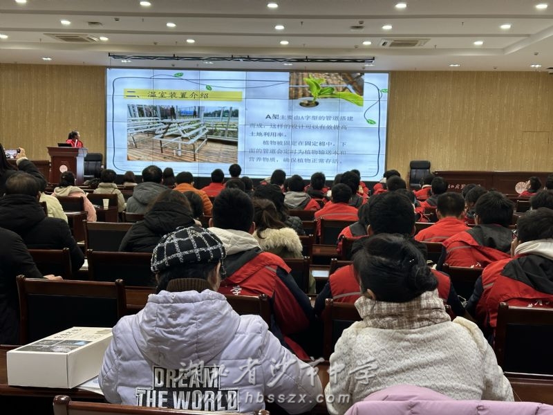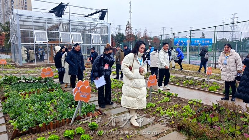 劳动教育课程研究性学习成果展示 最美的劳动在田间,最真的教育润心田。在沙市中学百草园,到访的嘉宾发现,那些温文儒雅的读书郎都化身小农夫,在沙市中学百草园里播种耕耘,淬炼成长。沙市中学百草园占地1500平米,划分为58块,班班都有责任田,里面种植了各种时令蔬菜和花卉。同学们充分运用所学的生物学、地理学知识,参与作物的种植、培育、养护。在大家的精心养护下,各班基地内的各类植物长势喜人,整个基地生机勃勃,绿意盎然。种植活动培养了学生的科学探究精神,锻炼了学生的动手实践能力,让他们在劳动中感受到了知识的力量和实践的意义,真正做到知行合一。本次开放日活动中,沙市中学2312班朱婷婷、2307班荣梓涵、2217班焦娇、2308班杨明亨和2314班苏若兮分别向嘉宾分享了主题为“无土栽培及温室装置介绍”、“校园植物分类调查报告”、“菜苔生长和天气关系的研究”、“紫菜苔叶片发黄的原因研究”和“蒜苗分瓣与整颗种植的差异研究”等劳动教育课程研究性学习成果。2216班学生代表做了百草园工作汇报及总结。