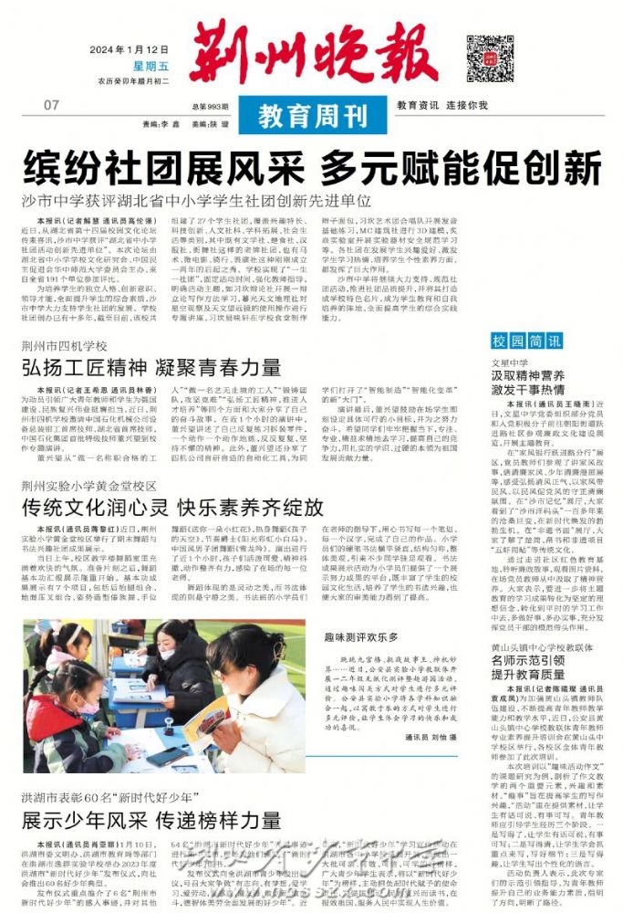 《荆州晚报》2024年1月12日报道我校获评湖北省中小学社团创新先进单位
