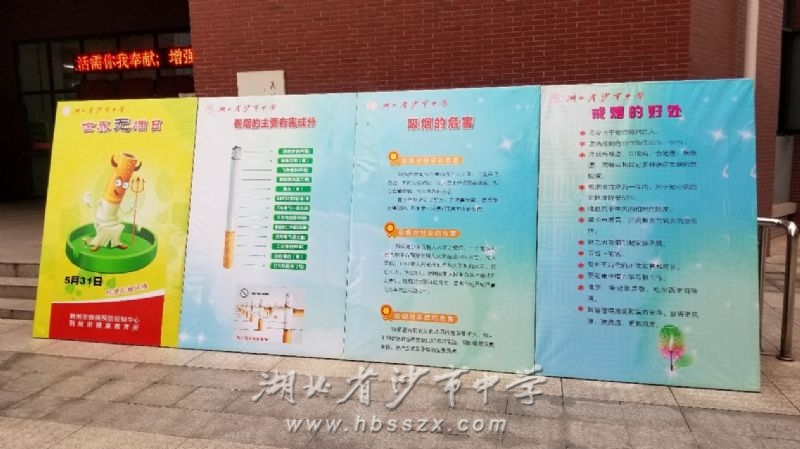 沙市中学一直以来非常重视校园控烟工作,学校成立控烟领导小组,并把控烟工作纳入学校总体工作计划。在学生教育方面,通过黑板报、班会、国旗下讲话、手抄报等多种形式开展禁烟宣传,利用图片、视频、真实事例等方式向同学们介绍世界无烟日的来历、吸烟的危害、戒烟的简单方法等知识。让学生深刻认识到吸烟的严重危害性,从而牢固树立禁烟意识,拒吸第一支烟。在教职工控烟方面,学校在教学楼和办公区设置大量的禁烟标志,并通过全校大会向全体教职工发出倡议,要求教师做学生行为的表率和示范,以身作则,起到榜样带头作用,共同维护校园清新健康的无烟环境。