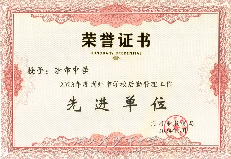 荣誉属于过去,奋斗赢取未来,沙市中学将继续强化后勤管理,以“管理育人,服务育人,环境育人”为宗旨,进一步使总务工作精细化,加大对校园食品安全的监管力度,努力提高细节管理水平,全面提升总务后勤工作效度。