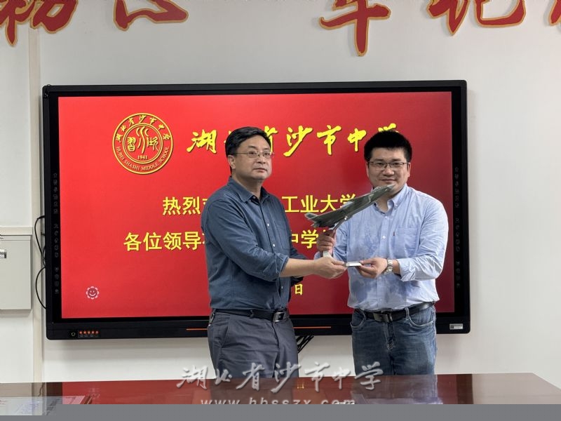 西北工业大学向我校赠送飞机模型 4月26日下午3点,西北工业大学和我校在沙市中学综合楼七楼会议室召开座谈会。徐斌教授代表西北工业大学感谢我校多年来对西北工业大学招生工作的大力支持,并向我校授予了“优质生源基地”牌匾,赠送了飞机模型。我校党委副书记、校长徐善慧表示,学校将利用“优质生源基地”这一良好平台,加强与西北工业大学的深入合作,共同培养习坎学子成为优秀人才。