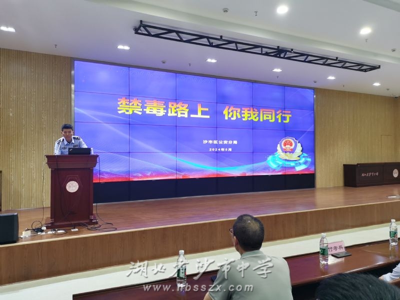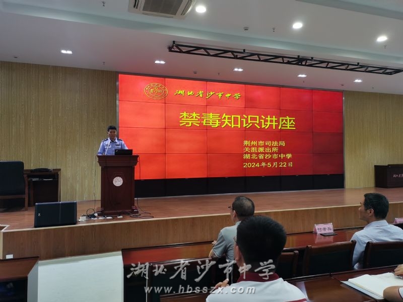 5月22日下午,沙市中学在综合楼二楼会议室开展禁毒知识专题讲座。荆州市司法局党委委员、副局长付孝兵、荆州市司法局普法与依法治理科副科长郭俊梅、关沮派出所所长梁世夫、关沮派出所民警桂涛和沙市中学党委委员、副校长胡直受邀出席活动,学工处主任李昌坤主持活动,高一年级部分学生参加了学习。关沮派出所民警桂涛以《禁毒路上 你我同行》为题开展专题讲座,向同学们科学阐释了毒品的概念,详细介绍了传统毒品和新型毒品的类型,分析了吸毒的诱因,教育同学们树立正确的人生观,不盲目追求享受和寻求刺激,谨慎交友,远离社会不良人员,自觉抵制诱惑,远离毒品。通过接受禁毒知识教育,同学们进一步了解了毒品的本质、种类和危害以及吸毒的诱因,深刻领悟了“吸毒一口,掉入虎口”的道理。