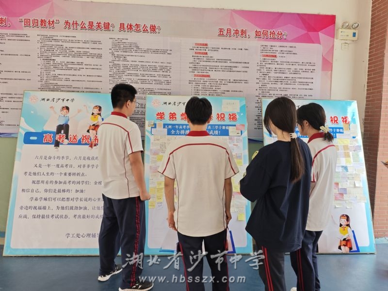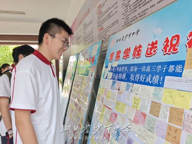 课间高三的学生们在展板前驻足观看,一句句暖心的祝福能在高考来临之前让学生们放松心情,从字里行间感受到习坎人的温暖,收获祝福的同时,获取高考前冲刺的力量。