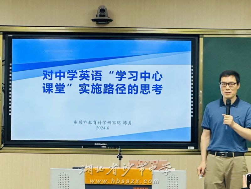 荆州中学赖锋利老师点评 荆州市教育科学研究院陈勇主任作了题为《对中学英语“学习中心课堂”实施路径的思考》的专题讲座。陈勇指出:1、英语学科“学习中心课堂”需从两个维度双管齐下:建设学生自主学习的课堂样态和建立英语语言能力培养的教学范式。2、要变传统的外压式的统一教学模式为内驱式的自主合作学习模式,将学习时间的自主权、学习内容的自主权、学习规划的自主权交给学生。3、开展自主学习需要从学习时空、学习能力、学习环境、学习动力四个方面进行。要求各位教师摆脱教材和考试进度的束缚:合理、灵活使用教材,超越教材。根据学生最近发展区引导学生动态选择恰当的学习内容,改变“慢节奏、低容量”的“灌输式、碎片式”教学模式。