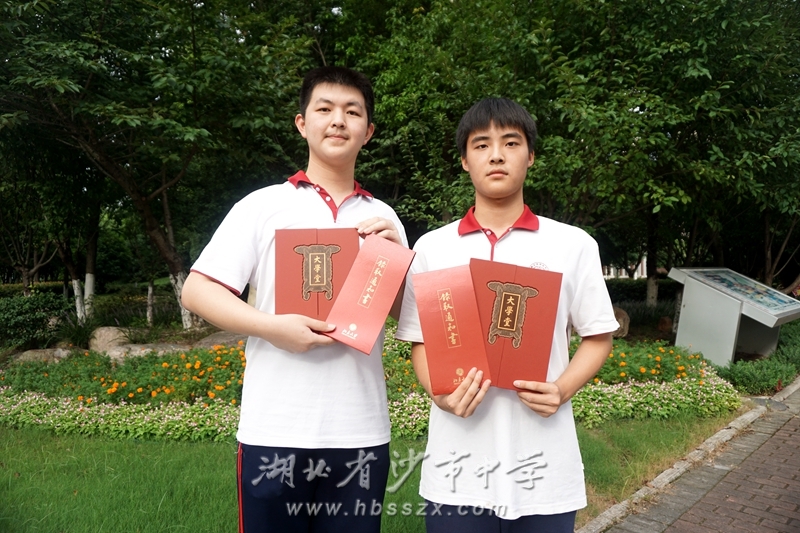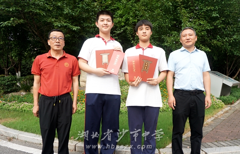 两位同学与班主任肖述友(左一)和学校党委委员、副校长唐年新(右一)合影 7月15日,对于沙市中学的2101班的刘小康、姚棋皓来说是一个意义非凡的日子。下午5:00,中国邮政集团有限公司荆州市分公司的揽投员将两份北京大学录取通知书分别送到了在沙市中学等候的两位学子手中。