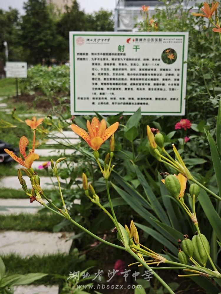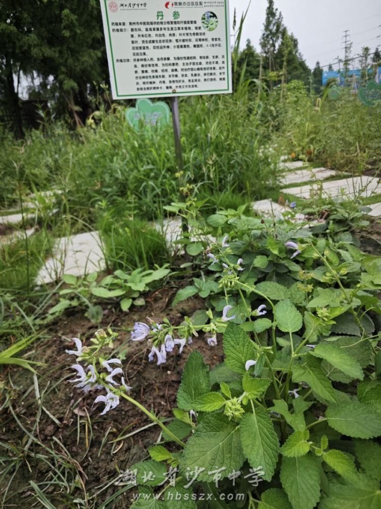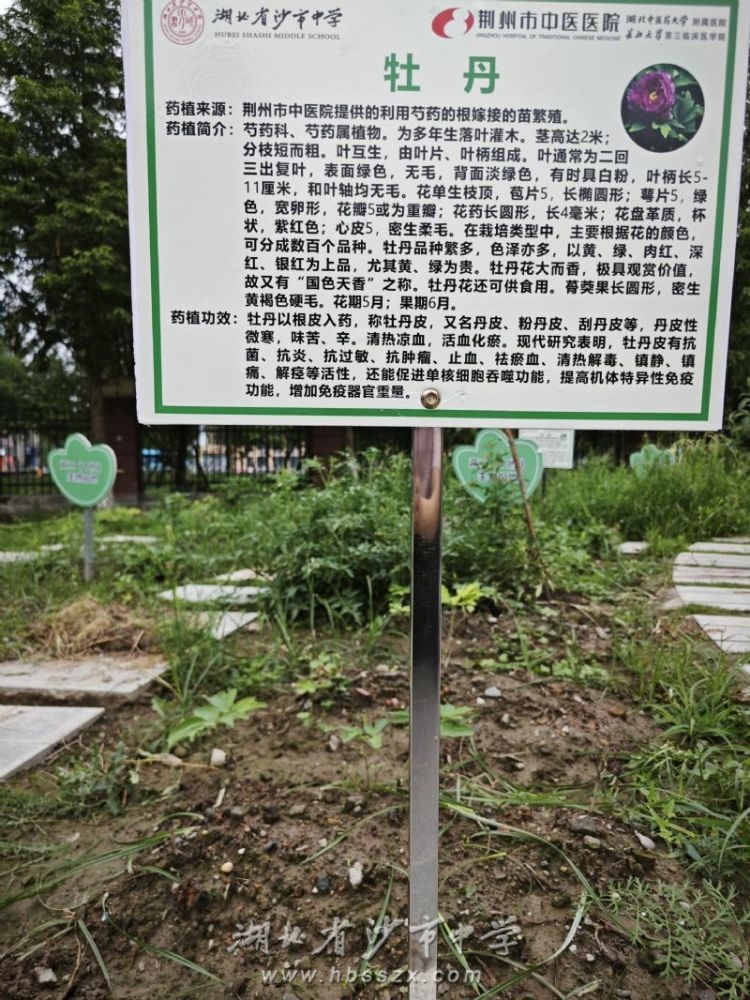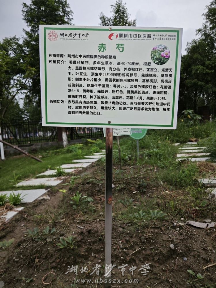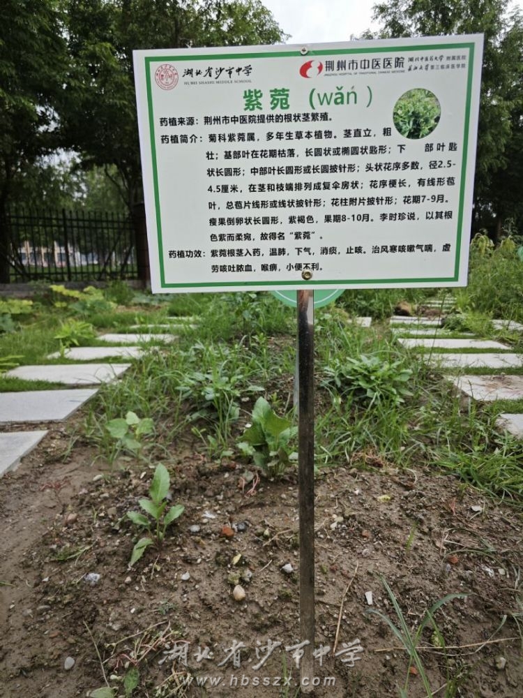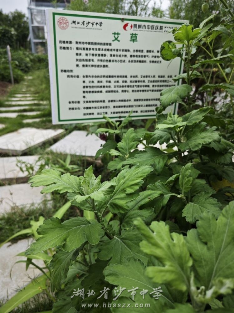 在中药种植区域,沙市中学利用与荆州市中医医院共建的“校园中医药文化基地”的良机和优势,在荆州市中医医院的指导和帮助下栽种了射干、艾草、丹参、牡丹、赤芍、紫菀等特色药用植物。每块药植种植区域旁树立了展示牌,详细介绍了药植的来源、简介和功效。中医药文化是中华民族的瑰宝,通过对药植的种植和科普,学生亲身体会并近距离感受中医药文化的独特魅力,极大增强了学生的文化自信。