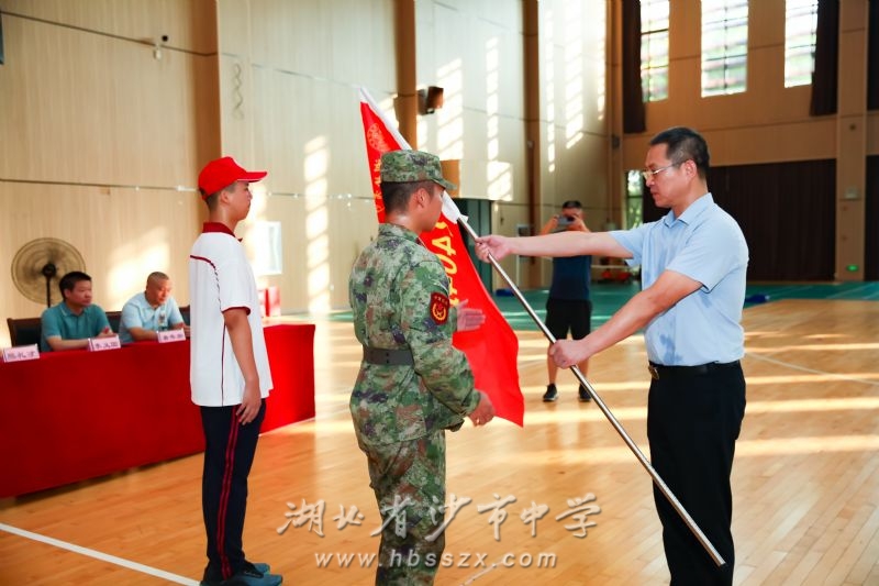 党委书记熊礼才郑重地为各班授旗,各班班长在教官的陪同下依次接旗。班旗预示着责任与使命的传递,饱含着学校对同学们的殷切期望,化为力量的源泉。