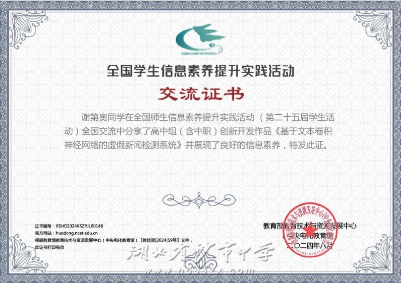 我校学生在日前结束的第二十五届全国学生信息素养提升实践活动中取得优异成绩,共获得全国交流证书(全国二等奖)1项、湖北省一等奖1项、湖北省二等奖1项、湖北省三等奖1项。