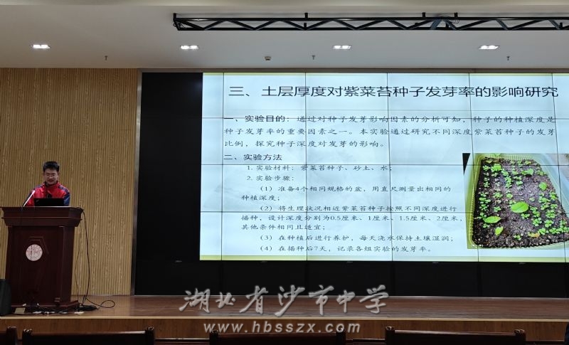 生物教研组集思广益,开展了百草园植物辨认、制作叶脉书签、探究习坎湖水质净化、探究非生物因素对紫菜苔种子发芽率的影响四大活动。各班学习小组将整个实践探究过程拟写成实验报告,在报告会现场,小组代表分享研究成果和集体智慧。